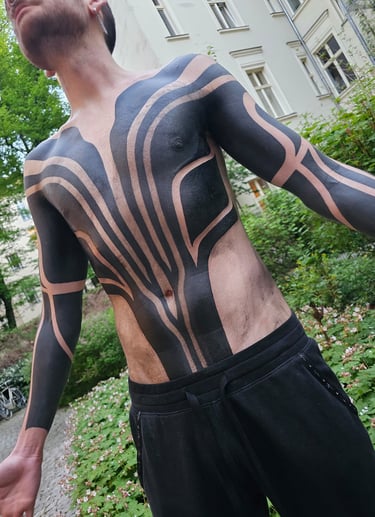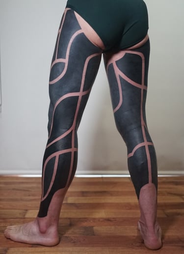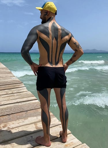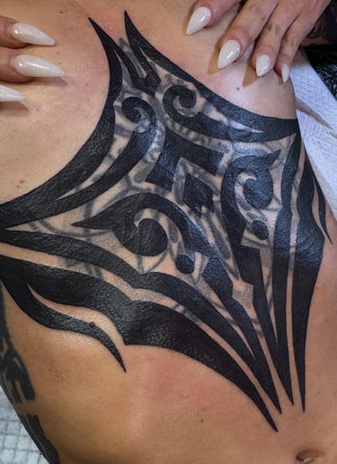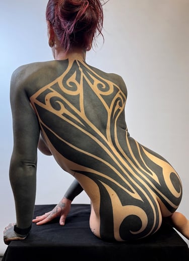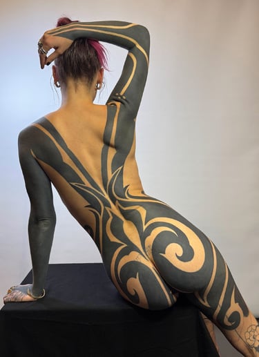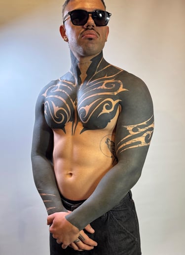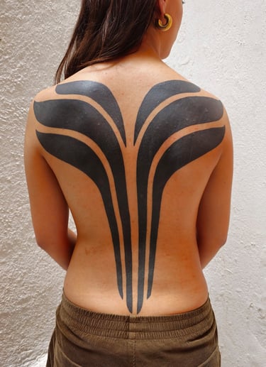 Anatomical and Stylized Design: The key to this style is its integration. Neotribal designs follow, accentuate, and stretch the body's natural shapes, enhancing musculature, curves, and the general silhouette to create an impactful and dynamic effect.